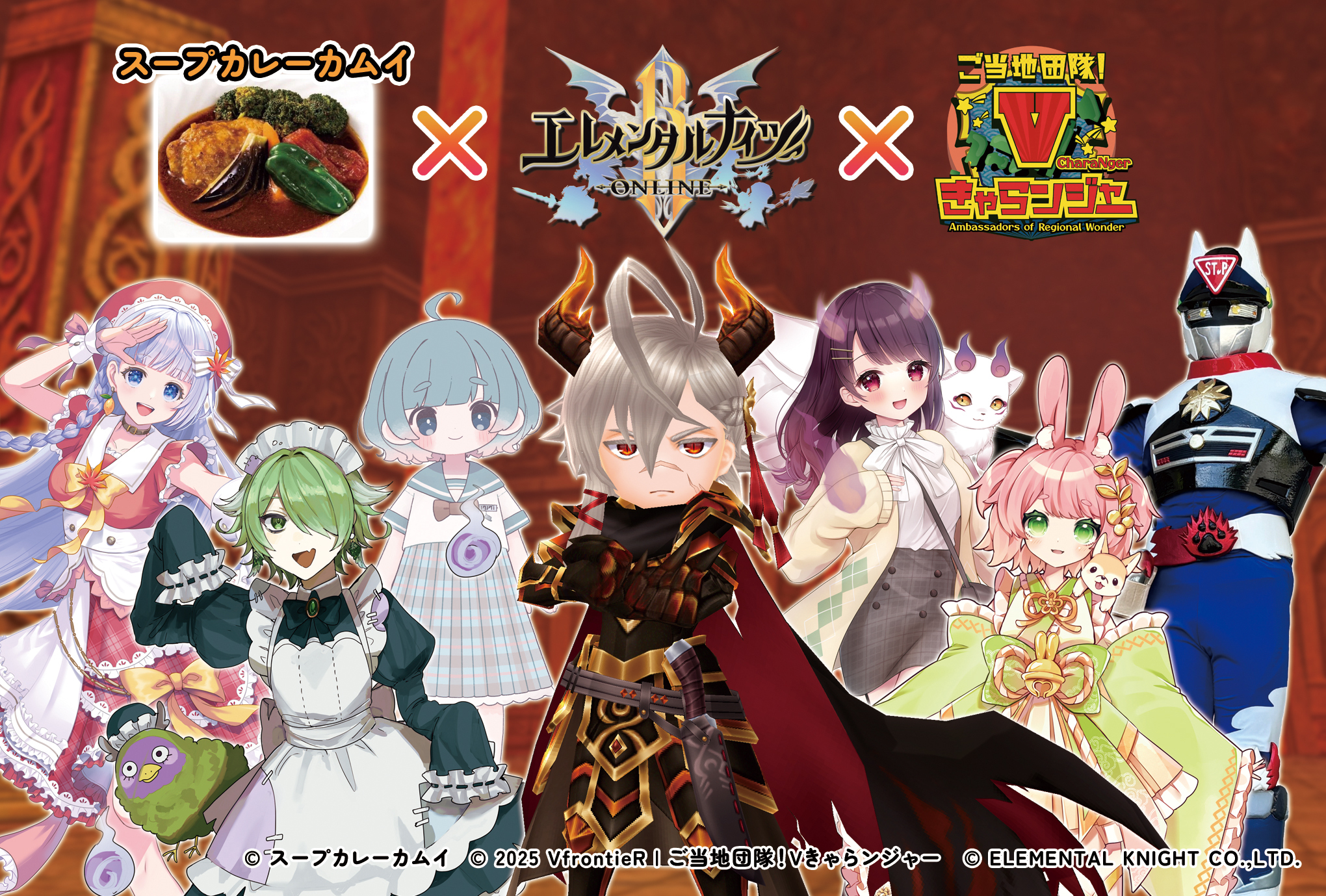 株式会社ウインライト(本社:東京都墨田区、代表取締役社長:藤本 勝寛)は、運営中のスマートフォン向けMMORPG『エレメンタルナイツオンラインR』(以下、エレナイ)において、東京都千代田区の人気スープカレー専門店「スープカレーカムイ」と、ご当地VTuber×キャラ×ヒーロー団隊「ご当地団隊!Vきゃらンジャー」とのコラボレーションキャンペーンを、2025年11月16日(日)より開催いたします。