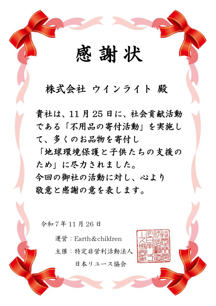 株式会社ウインライトは、限りある資源を大切にするという考えのもと、今年も「Earth and Children」へ物品の寄付を実施いたしました。